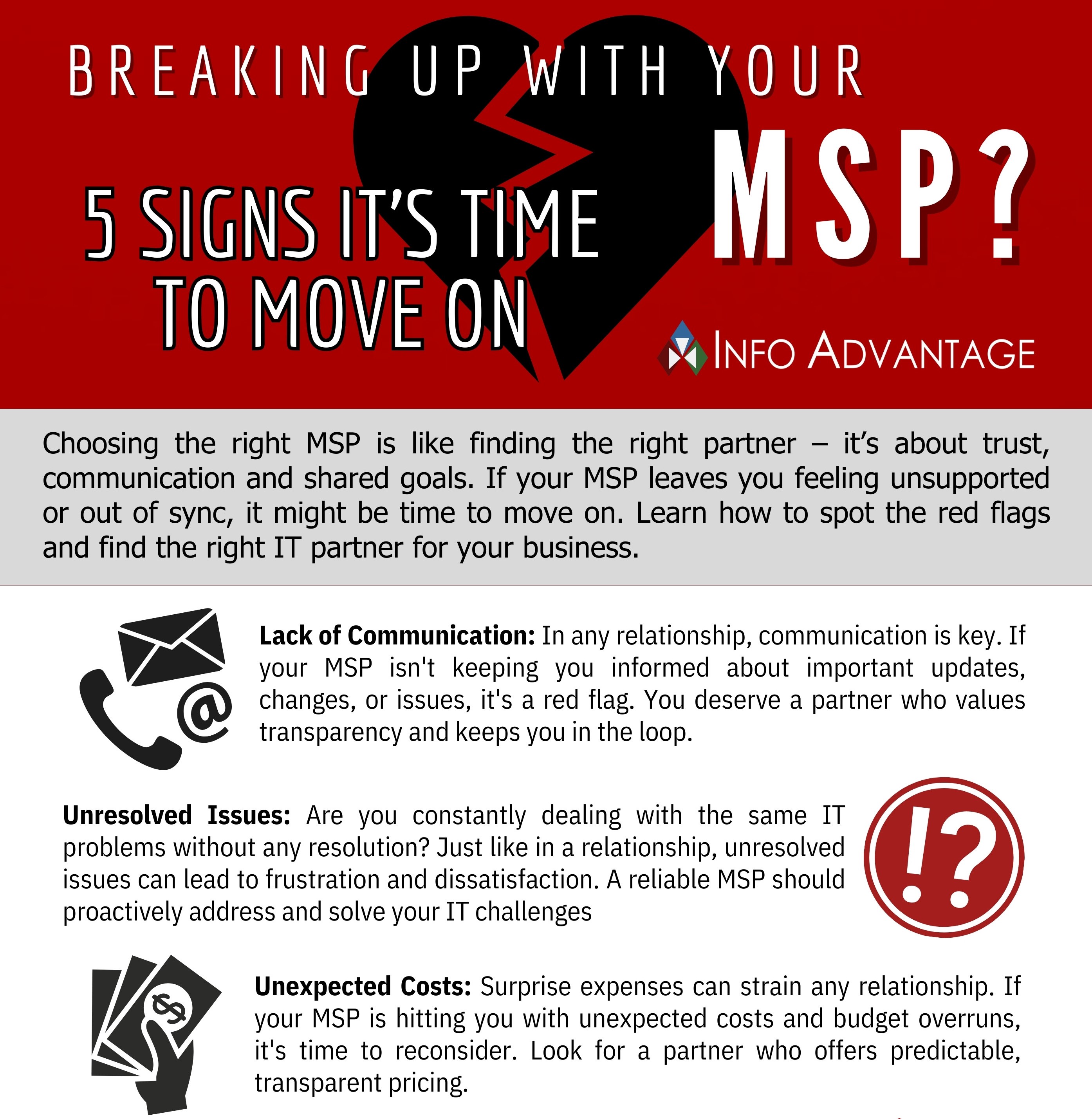 In Breaking Up With Your MSP: 5 Signs It’s Time to Move On, we break down the most common red flags businesses experience with their IT providers—from poor communication and unresolved issues to surprise costs and lack of innovation. This quick, practical guide will help you evaluate your current MSP relationship and decide whether it’s truly serving your business’s needs.