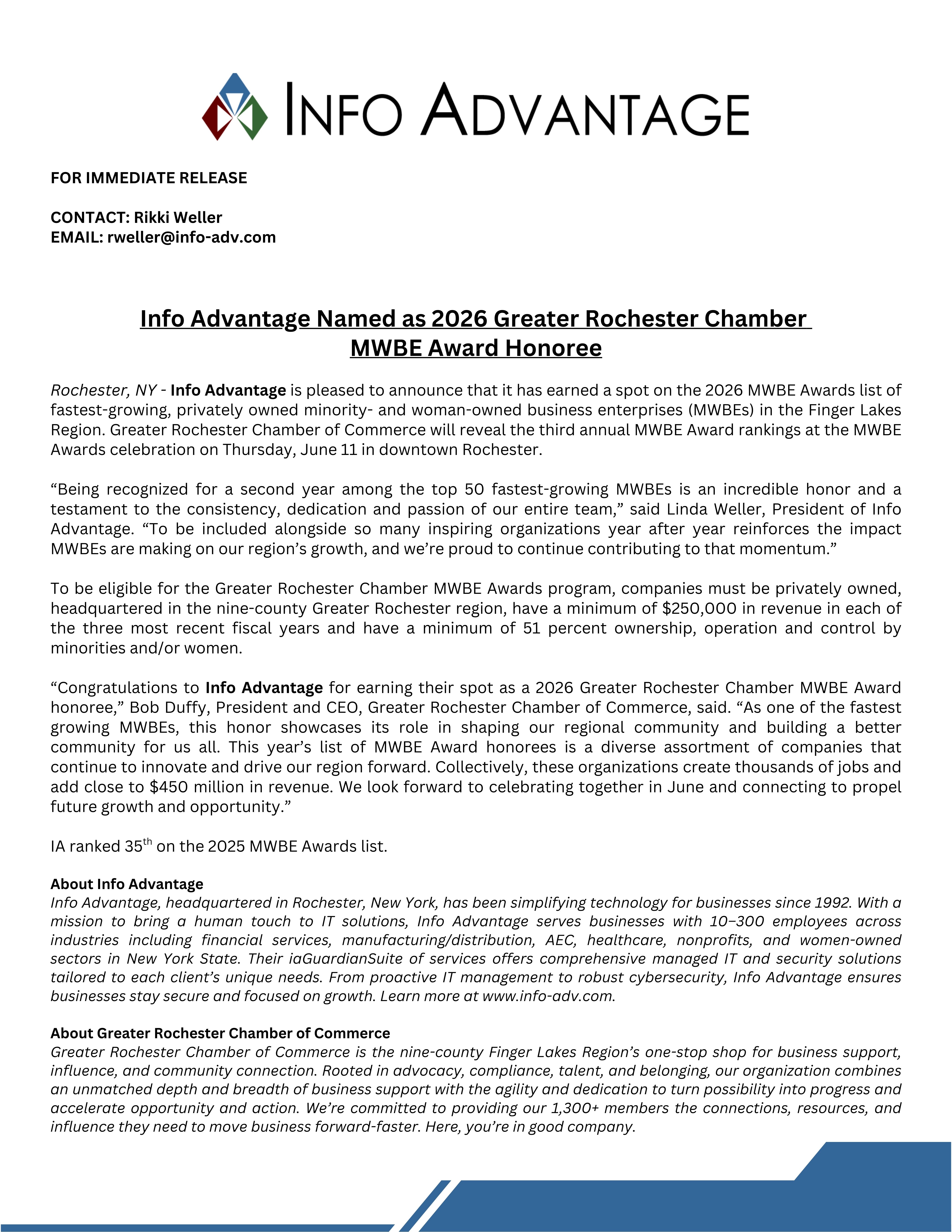 Greater Rochester Chamber MWBE Award - Top 50 (35th)